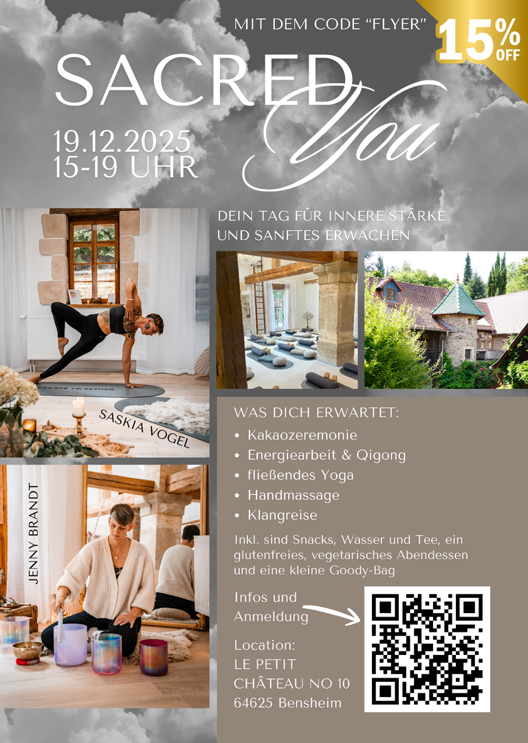 Unser Tages Retreat ist eine Einladung deine innere Stärke wieder zu entdecken. Einen Tag lang darfst Du loslassen, auftanken, heilen & dich selbst spüren. Sanftes Yoga, Kakao, Massagen, Energiearbeit und Klang, begleiten dich durch den Tag